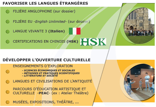 * ces heures supplémentaires sont enseignées par un professeur anglophone et consacrées à l’étude de la civilisation anglo-saxonne.  Ces filières se poursuivent en cycle terminal  selon les mêmes modalités et au cours de cette scolarité spécifique, des séjours internationaux sont proposés