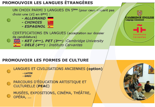 Le cycle d’orientation permet de compléter les acquisitions du collège et de préparer aux formations générales, technologiques et professionnelles. En troisième, les élèves poursuivent l’apprentissage des langues vivantes étudiées en classe de quatrième. À la fin de l’année de troisième, les élèves présentent le diplôme national du brevet et devront faire le choix de leur orientation.